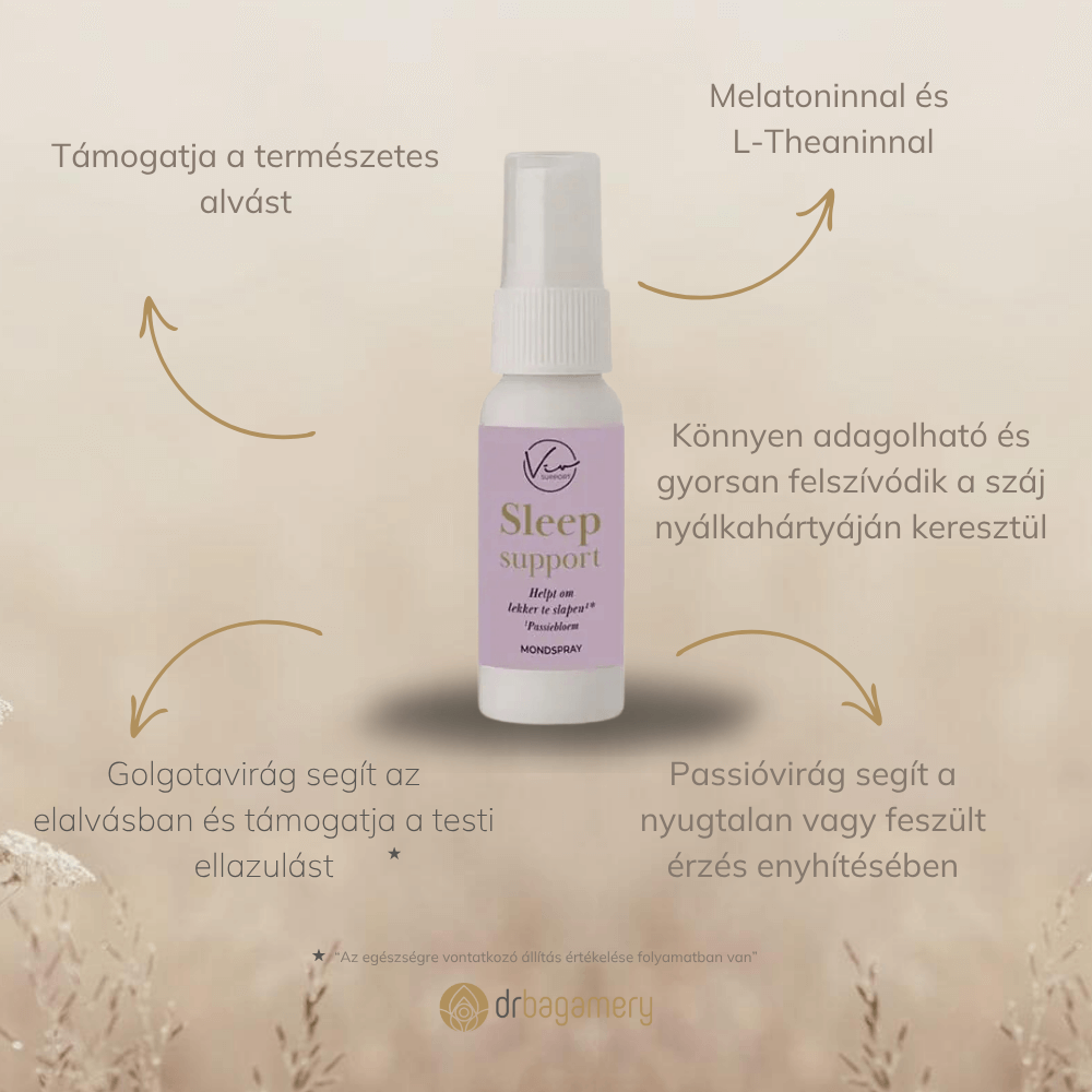 A Sleep Support szájspray nyugtatóan hat, segíti az elalvást, és támogatja a természetes éjszakai pihenést.